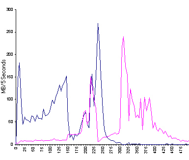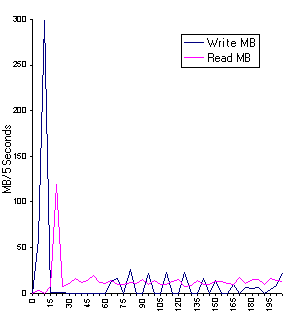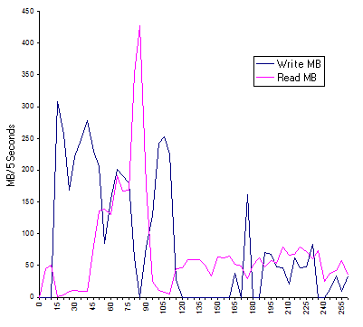 Tests were run with Performance Monitor logging of Physical Disk Write and Read Bytes and Bytes/Second. The graphs below are extrapolations of million bytes written and read over the 5 second monitoring periods. At least they confirm that the disks can run at 50 to 60 MB/second. CPU utilisation was also reported and was extremely low for most of the time.